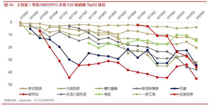 长线顶流产品支撑力对于公司发展起到至关重要的作用:不难发现,头部游戏公司长线产品均增加。腾讯为长线产品数量最多的游戏厂商,其次为网易。我们定义长线产品为发行时间超过一年的产品,下图为当前时间段发行的打入畅销榜Top50的长线产品,腾讯、网易、完美这样的头部游戏厂商的核心产品在进入畅销榜后持续性较强,长线产品数量不断增加。