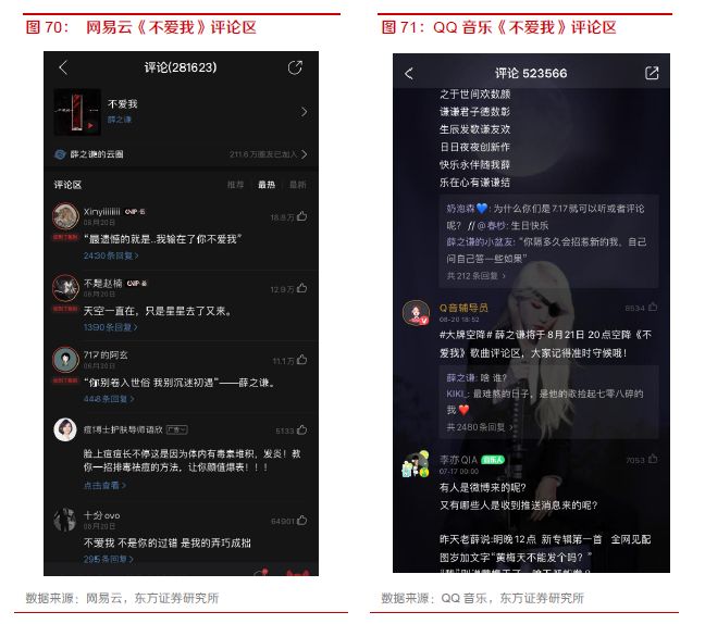 从评论质量的角度,网易云音乐可以说是超越其他平台,截取薛之谦《不爱我》评论区,QQ音乐中被大量的复制应援文案刷屏,而网易云音乐中热度靠前的则是大量与音乐有关的情感抒发式评论。