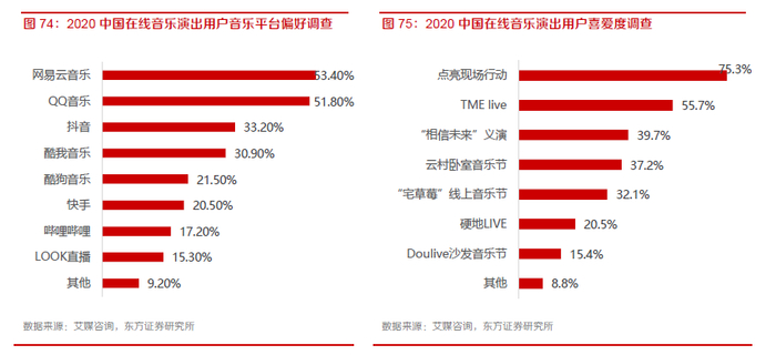 网易云音乐率先探索在线音乐演出的付费模式,在在线音乐演出平台偏好调查中以53.4%的占比获得第一。2月,网易云音乐发起“云村卧室音乐节”, 4月发起“点亮现场行动”,10月再次推出“线上LIVE”活动,在音乐付费直播方面持续发力。