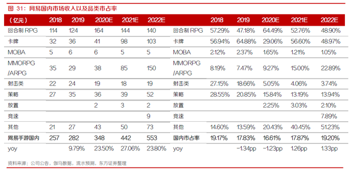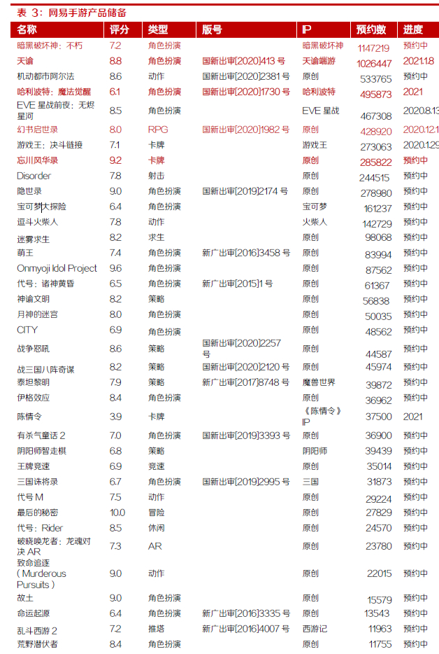 2)21年网易卡牌类手游产品放量,20年末《幻书启世录》、21年《哈利波特:魔法觉醒》、《忘川风华录》、《隐世录》、《游戏王:决斗链接》等预期带动品类市占率显著提升。