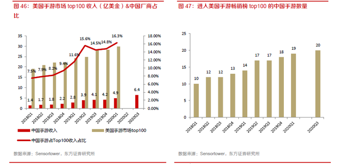 国内行业增速:大产品驱动增长2020年手游行业收入2097亿,收入同比增长33%。用户增速:手游用户数已超过6.5亿,全年用户数同比增长5%。ARPU增速:上半年因为用户在线时长提升,头部产品付费水平高速拉升,Q1手游行业收入同比增长47%,ARPU同比增长40%;Q4手游收入同比增长35%,顶流产品《原神》、《天涯明月刀》上线表现亮眼拉升ARPU增速, 20年ARPU同比增长26%。