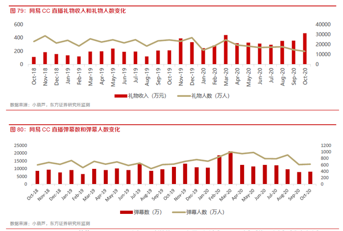 根据监测数据显示,20Q3网易CC实现直播流水6.7亿(yoy+91.7%,qoq+4.7%),在礼物人数有所下滑的情况下礼物收入整体保持上升的趋势,主要系Q3各类电竞赛事、自制综艺等优质内容增加用户付费意愿,人均贡献度增长。