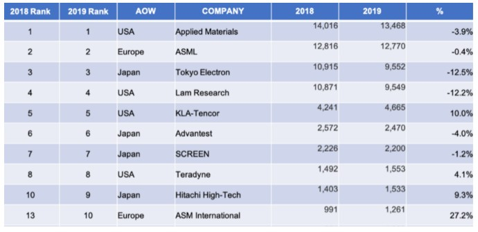 如今的半导体设备行业已经是高度集中的市场格局,应用材料、阿斯麦(ASML.US)、东京电子、泛林半导体、科磊半导体2019年牢牢占据了全球前五的位置。而这些厂商正是在前一轮的积极并购后慢慢定型,成为了业内的标杆企业。