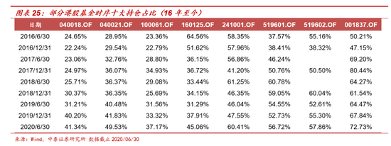 截止2020年半年报,持股较集中的三个港股基金分别为前海开源沪港深聚瑞(007151.OF)、博时沪港深成长企业(001824.OF)与华泰柏瑞亚洲企业(460010.OF),前十大持仓占比分别为87.9%、69.7%与66.3%。持仓较为分散的三个港股基金分别为华泰柏瑞港股通量化(005269.OF)、泰康沪港深精选(002653.OF)、工银瑞信新经济人民币(005699.OF),前十大持仓分别为19.4%、27.7%与34.05%。