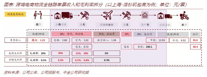 我们对跨境电商物流的全链路收入、毛利率进行了深度拆分。以上海-洛杉矶包裹为例,在揽、拣、关、运、关、仓、派7个环节中,仓拣、通关的表观毛利率最高,达30%;从全链路毛利率来看,仓拣、订舱通关的毛利率分别为3.2%、1.3%,合计4.5%,按3395亿元的出口跨境电商物流收入,毛利总额约为153亿元(不包含海外仓拣)。