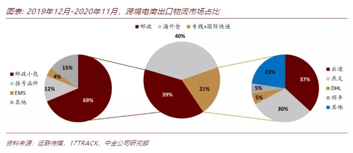 根据运联传媒数据,2020年跨境电商出口中,邮政占39%、海外仓占40%,国际快递和专线占21%。根据17track数据统计测算,2019年12月-2020年11月,国际快递和专线中,云途、燕文、DHL、顺丰的市占率分别为37%、30%、5%、5%;进一步拆分邮政系包裹,邮政小包、挂号函件、EMS占比为69%、12%、4%。虽然2020年邮政份额有所下降,但整体市占率仍在39%左右,远高于民营第三方物流。