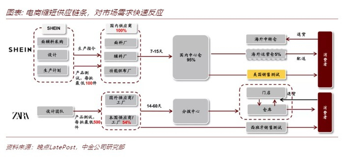 生产供应端,SheIn依托国内完整的服装产业链,搭建了一条高效、通达全球的服装供应链。SheIn将国内中心仓设立在广州,与围绕在它旁边的数百家工厂组成了完整的快时尚产业集群。与工厂毗邻,SheIn对供应商有更多掌控能力,订单响应迅速及时,工厂订单最快交付时间为7天,而快时尚巨头Zara 最快也要14天。