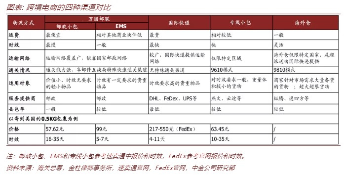 考虑成本效率和覆盖率,预计短期内邮政渠道仍将占主导。对比目前主流的四种跨境电商物流渠道:邮政价格最低、覆盖率最高、速度最慢,是跨境电商出口物流的主流。国际快递价格最高、覆盖率较高、速度最快,适合低频次的物流需求;专线小包的时效价格介于两者之间,但对商品品类、规格有诸多限制;海外仓时效较快、方便退换货,对品类、规格的限制较小,但履约费用略高。