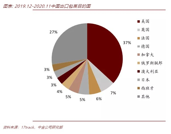 跨境电商出口物流分为直邮和海外仓两种模式,直邮占出口的60%。直邮模式是指订单产生后,卖家从国内仓库发货直接运抵消费者;海外仓模式是指境内企业将商品提前通过跨境物流送达位于海外的仓库,订单下达后商品从海外仓运出,送达消费者。根据17track数据统计,最近12个月中,中国发出的直邮包裹37%流向美国,前九大均为发达国家。