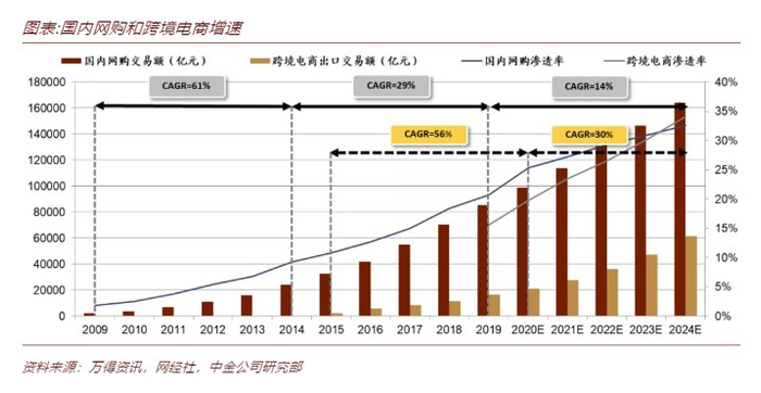 从增量趋势看,跨境电商出口未来五年有望保持30%的增速。2015-2020年,跨境电商交易额CAGR约为56%(假设2020年同比增长30%),略低于国内网购2009-2014年的增速水平。参考国内电商成长路径,线上消费分层或将在跨境电商市场重演。当前的跨境电商出口主要为4G通讯普及的发达国家,往后看,发展中国家或将成为跨境电商市场的重要增量。因此,我们预计,跨境电商未来四年年均增速仍将在30%以上。假设2020-2024年跨境电商B2C交易额CAGR为30%,那么2024年,跨境电商出口交易额将达到6万亿元,是2020年的3倍左右,约为国内网购2017-2018年的水平。