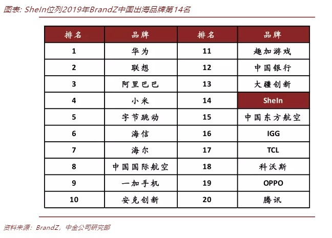 SheIn是一家集合设计、生产和销售的跨境B2C电商平台,产品主要是女性快时尚,以高周转、快交付、高性价比著称。SheIn在销售端依靠跨境电商直接打入海外市场,生产供应端构建了立足于国内的完整制造供应链,从而形成了C2M的生产组织模式,能够快速响应并占领市场。公司2014年成立,2019年已经成功位列BrandZ中国出海品牌第14名。