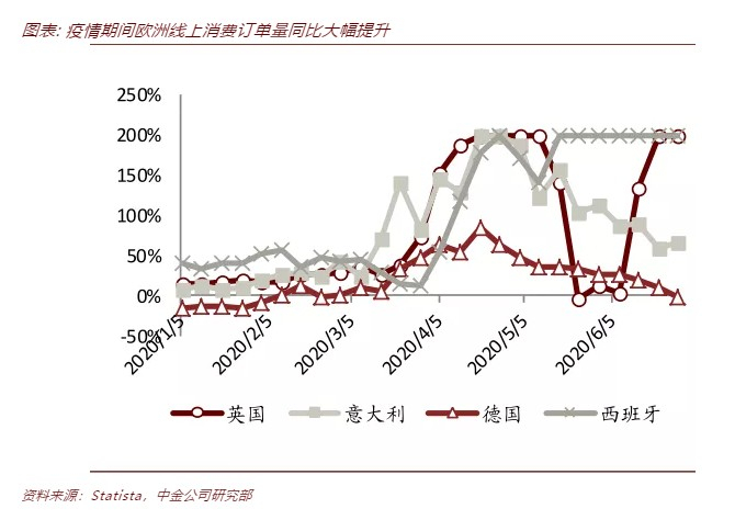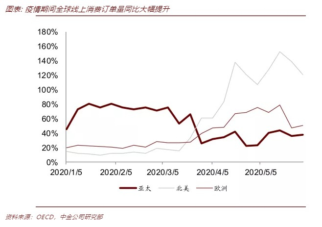 卫生事件限制出行,全球网购渗透率大幅提升。根据OECD的研究,2020年全球线上消费订单量同比大幅增长,其中亚太、欧洲地区在卫生事件期间最高增幅达80%,而北美地区最高增幅达150%。根据Statista数据,自2020年4月起,英国、意大利、德国、西班牙的线上消费订单量同比提升100%-200%。