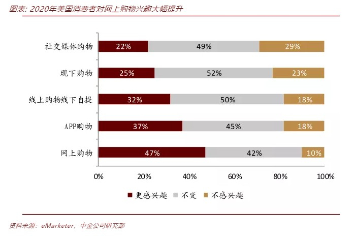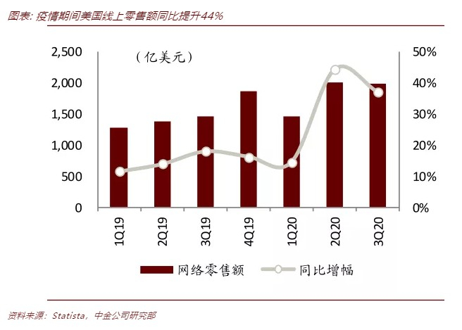 海外线上消费粘性形成,消费习惯培育期缩短。根据Statista和eMarketer的数据,2020年,美国消费者对网上购物兴趣大幅提升。47%的消费者表示对网络购物更感兴趣。从线上零售额来看,美国线上零售额2Q、3Q分别同比提升44%、37%,消费者线上消费意愿和消费金额同步增长,线上消费粘性逐步形成。
