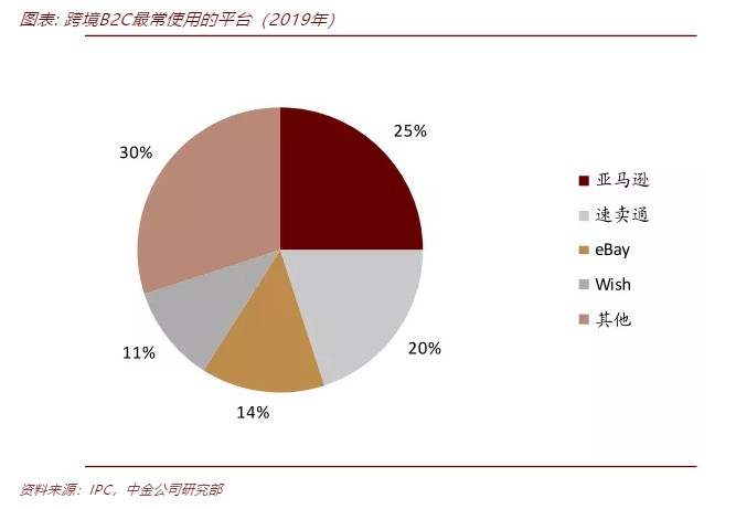 跨境电商B2C出口呈四足鼎立格局, 阿里系占进口的50%+。具体看交易平台,出口方面,跨境电商B2C平台呈现四足鼎立。根据IPC发布的调研,全球最常被用来进行跨境购物的电商平台中,亚马逊/速卖通/eBay(EBAY.US)/Wish各占25%/20%/14%/11%,此外区域性电商(如Lazada,Shopee)和细分行业独立站(SheIn,Zaful,Gearbest)也占据一部分市场。