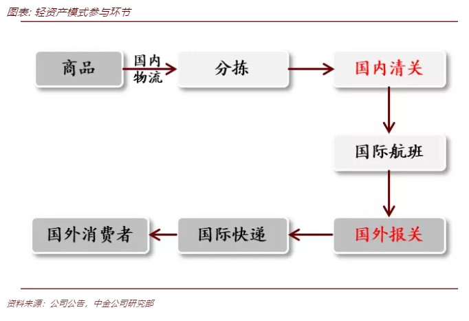 轻资产模式中,跨境电商物流企业主要参与国内首公里后的打包和分拣、国内清关和干线(订舱或包机),国外报关三四个环节,几乎不涉及仓库运营。