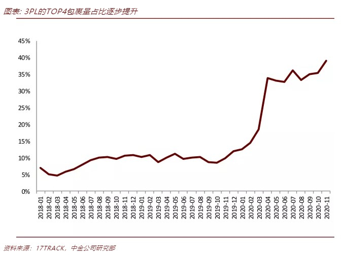 从包裹量看,民营第三方物流企业正加速渗透。卫生事件期间邮政暴露诸多弱点,包括运力不稳定、包裹爆仓、丢包率高等,倒逼行业变革。出口直邮中,邮政占比自2019年10月的86%逐步下滑到2020年11月的51.8%。而云途(纵腾集团旗下跨境专线物流公司)、燕文、DHL、顺丰等三方物流企业在出口直邮中的包裹量占比提升至39%,其中仅云途和燕文占比就达到了31%。我们认为,未来国际包裹的稳定性、时效性、性价比将得到重视,第三方物流对市场的整合速度进一步提升。