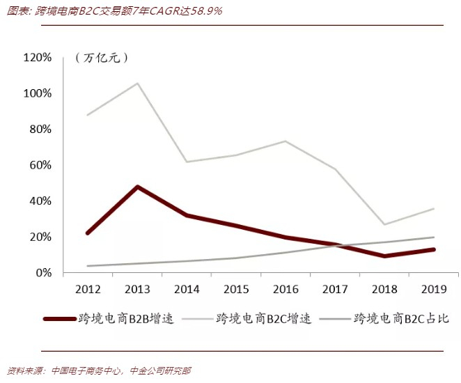 2019年跨境电商B2C出口1.63万亿元,4年CAGR达63%。根据网经社数据,2019年,跨境电商交易规模达10.5万亿元,占31.54万亿元进出口总额的33.27%。其中B2C交易额为2.0万亿元,2012-2019年CAGR达58.9%,远高于B2B交易额CAGR(22.7%)。按进出口细分,在2.0万亿元跨境电商B2C交易中,出口约为1.63万亿元,占79.8%,2015-2019年CAGR为63%,高于进口CAGR(19.1%),跨境电商B2C出口渗透率2015年的1.64%到2019年的9.47%(占出口总额)。