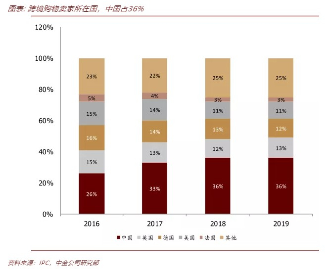 海外国家电商渗透率均低于20%,存在提升空间。从2019年数据看,欧美日韩等发达国家的网购渗透率均低于20%,考虑到当前的跨境电商出口主要为发达国家,发展中国家的4G通讯落后,我们估计网购渗透率更低,全球零售线上化率的提升空间还很大。往后看,发展中国家或将成为跨境电商市场的重要增量。作为世界最大的制造基地和网购消费国,中国有望充分受益于全球零售线上化。根据国际邮政公司(IPC)的调研,2019年全球36%的跨境卖家位于中国,且近年来比例不断提升。