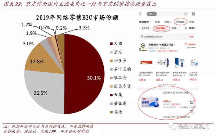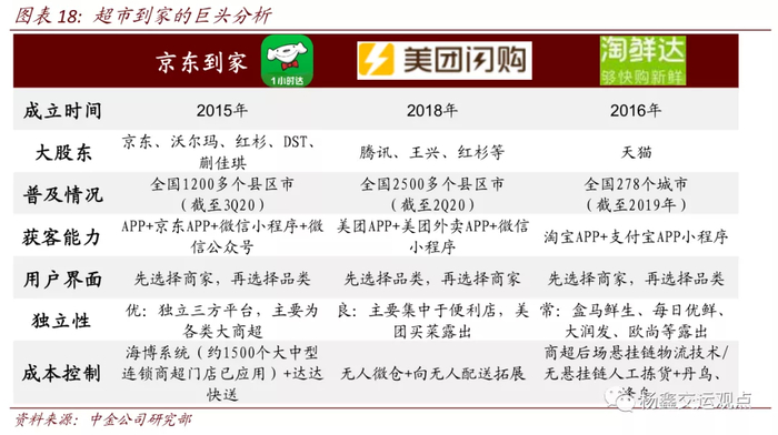 ►流量层面,到家平台利用原有电商平台优势、原有生态系统为商超导流,如:京东为京东到家导流(比如物竞天择项目,详见后文分析),淘宝为淘鲜达导流,美团为美团闪购导流等。