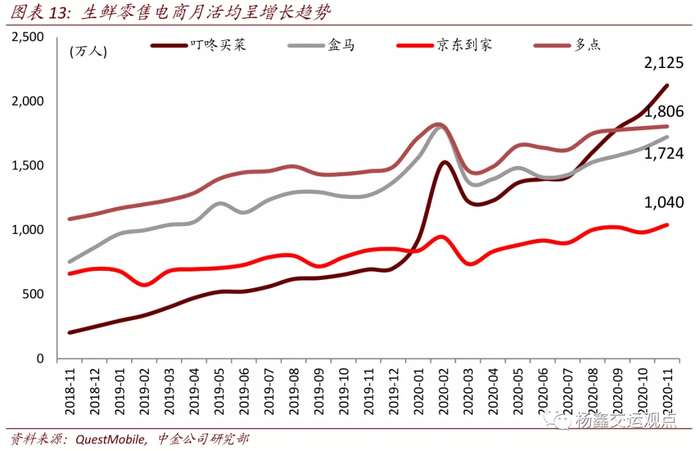 即时性零售模式短期发展有所加速。2014年以来,也涌现了一批即时零售模式的优秀公司如每日优鲜、盒马鲜生等,这些公司在部分区域具备了一定的订单规模与盈利模式。而2020年初以来,受卫生事件催化,零售线上化趋势加速。与此同时,社区团购的快速发展,倒逼着线下商超加速线上化转型的进程,为“即时性消费”的电商平台与超市卖场合作提供了可能,稳固了中高线城市的市场地位。数据上看,叮咚买菜、多点、盒马鲜生、京东到家2020年1-11月平均月活同比分别增长190%/23%/33%/26%