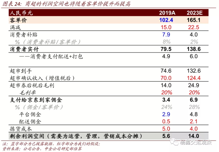 相较于已处于较成熟阶段的外卖业务,商超到家具有更高的客单价,但因商业模式相似,其发展过程具一定参考意义。参考美团的外卖平台业务,行业初期各家为抢占市场份额处于高消费者补贴和低商家佣金率状态,随着市占率提升至绝对龙头的水平(接近70%),补贴占GMV比值由2015年的8.8%降至2019年的3.1%(图表25),而佣金率由2015年1.1%提升至12.6%。因此,美团的运营利润于2019年第二季度扭亏为盈,2019年全年Non-IFRS运营利润率达到2.5%且预计未来将进一步提升。