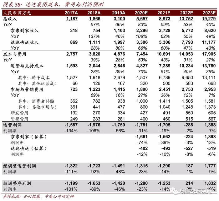 ►营收:我们预计达达快送2020-2022年收入分别增长71%/46%/34%
