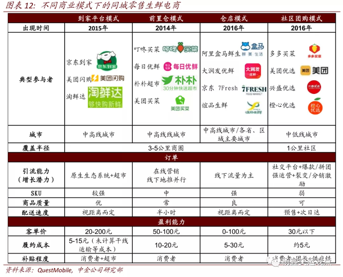 2)即时性消费的三种模式对比:仓店一体化模式&前置仓模式&超市到家模式