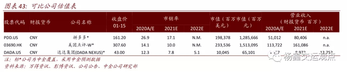 我们得到的公司估值对应9.0倍2021年P/S,我们参考对比可比公司美团和拼多多对应的2021年P/S 10.0倍和17.1倍,相对前两者仍存在一定折价。