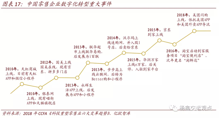 头部超市率先尝试到家模式,由发展自营到上线第三方平台。到家模式扩大了商超的服务半径(由1km扩大至3km)、增加下单用户,一定程度上提高了销售额的天花板。为此头部超市在十年前便开始了到家模式的摸索。早在2010年,天虹商城上线,目前天虹APP和微信小程序仍在运转;2013年永辉生活APP上线,后发展为APP和小程序等。但线下商超自营小程序与App成本较高,且靠超市自身进行导流,新增流量有限,因而不少商超进而转向三方平台,2014年沃尔玛上线速购网,并入股1号店后卖给京东;2015年华润万家上线e万家,后关停入驻到多个第三方到家平台等。