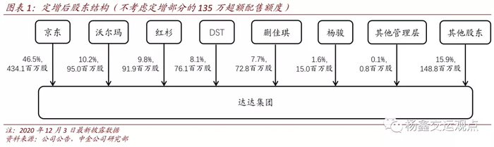 2020年6月,达达集团(DADA.O)于美股上市,公司IPO时共计发行8,000万股(2,000万ADS),超额配售行权948万股(237万ADS),12月定增3600万股(900万ADS),超额配售额度540万股(135万ADS),以上股票发行合计融资额8.1亿美元,占目前总股本的13.4%。目前,京东集团持股占比46.5%、沃尔玛持股占比10.2%,前两大股东与达达均保持了紧密的业务合作(2019年来自京东集团与沃尔玛的收入分别占达达集团总收入的50.5%与13.0%)。此外,红杉持股9.8%,DST持股8.1%,创始人兼CEO蒯佳琪持股约7.7%,CTO杨骏持股约1.6%,其他管理层持股约0.1%。