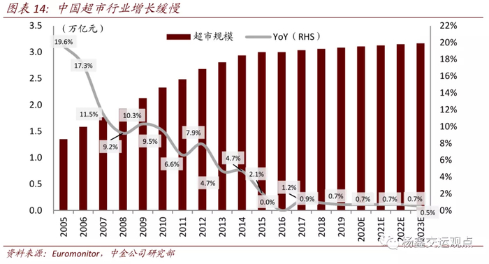 三种模式在消费升级背景下,共同的市场规模也在万亿元级别。随着城镇居民收入水平的提高,他们更加愿意为时间付费。由于这三种模式的客户群体大多分布在高线城市,线下商超与卖场(尤其中高端商超)目前的GMV规模为他们提供了市场规模的参考。根据Euromonitor数据,2019年我国超市行业规模约3.1万亿元,其中,根据中国连锁经营协会数据,2019年超市百强销售规模为9,792亿元(同比增长4.1%),市场规模也达到了万亿元级别。我国国土面积广阔、人口众多,区域、城乡之间的经济水平和居民消费水平或将长期存在差距。我们基于消费分层长期存在的假设,认为社区团购蓬勃发展的同时,即时性电商模式也会迎来行业长期向上,我们认为以上三种模式所在的市场规模长期来看或也在万亿元以上。