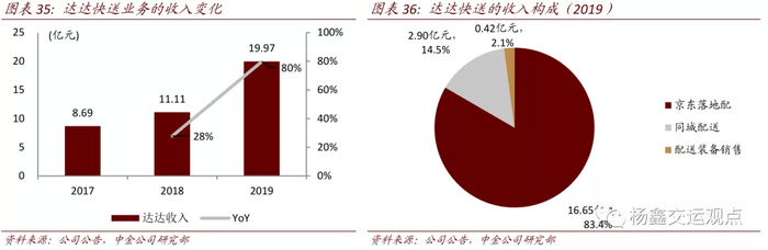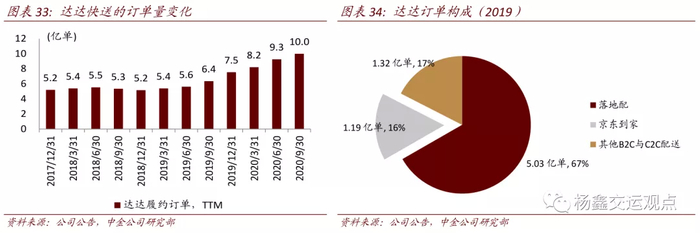 达达快送包括落地配与同城配,而后者是业务重点发展方向。达达快送业务分为两部分:一是作为补充运力完成京东物流的落地配,发挥削峰填谷的作用,二是帮助超市或其他零售商完成同城配,1小时内将商品送至消费者手中。2019年,达达快送实现总订单量约6亿单(已剔除帮助京东到家配送的订单,同比增长53%)、收入20.0亿元(同比增长80%),其中我们估计落地配实现5亿单、15.1亿元收入(占比76%,同比增长67%);同城配1亿单(已剔除京东到家的订单)、3.1亿元(占比15%,同比增长91%),这部分外部订单数量历史增速快于京东到家和京东物流产生的单量,未来也是公司重点发展方向