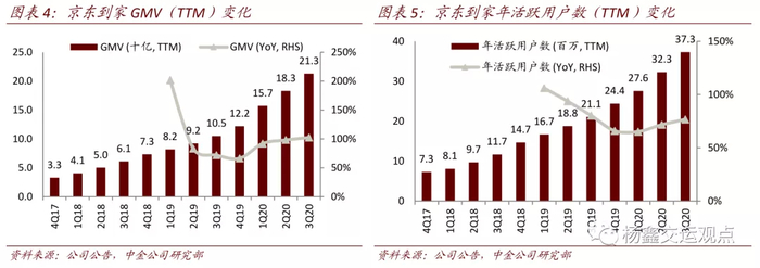 京东到家为平台模式,不经营自营电商业务,与线下商超和品牌商合作,依托达达快送的即时配送网络,为消费者提供超市便利、生鲜果蔬、医药健康、鲜花蛋糕、烘焙茶点、家居时尚等品类即时配送到家的服务。截至2020年三季度末,京东到家业务覆盖全国1,200多个县区市。截至2020年9月30日向前12个月,京东到家年活跃用户数达3,730万,同比增长77 %,2017-2019年复合增速达83%。1-3Q20京东到家实现收入15.76亿元(同比+110%),占集团总收入比重提升为42%,2017-2019年营收复合增速达86%。截至2020年9月30日向前12个月,京东到家平台交易总额达到213亿元,同比增长103%,2017-2019年复合增速达93%。1-3Q20,京东到家稳居中国本地零售商超O2O平台市场份额第一,市占率从2019年的21%提升至3Q20的24%。