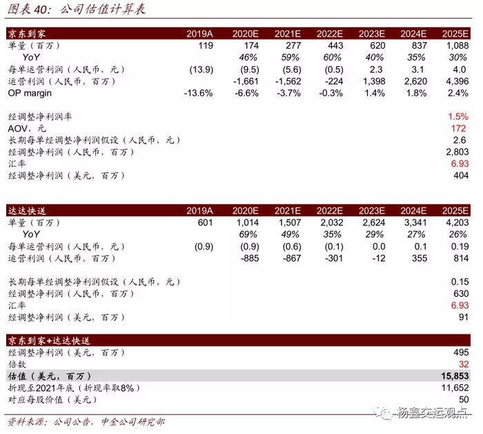 ►对于达达快送业务,我们假设到2025年能实现42亿单、每单净利润0.15元,得到6.30亿元利润。