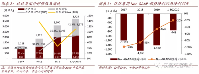 达达集团正处于高速发展通道,1-3Q20营收37.2亿元,同比增长95%,2017-2019年营收复合增速高达60%;2019年毛利润由负转正达2.5亿元,1-3Q20毛利润达6.4亿元,同比增长325%,毛利润率为17%。在净利润层面,目前公司仍处于净亏损状态,但净利润率持续改善,2017-2019及1-3Q20 Non-GAAP调整净利润分别-12.0/-16.5/-14.2/-7.5亿元,Non-GAAP调整净利润率分别对应为-98%/-86%/-46%/-20%。