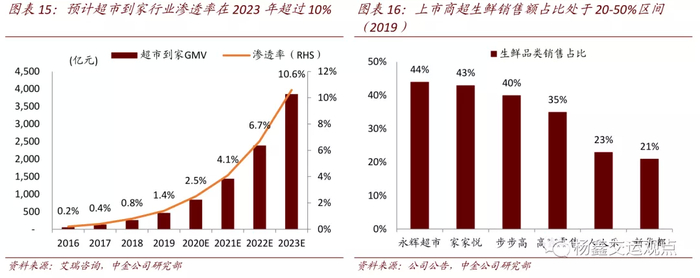 当前头部商超同时采用自营与入驻平台两种方式,超市到家业务初具规模。根据中国连锁经营协会数据,2019年超市百强线上销售额接近500亿元,同比翻倍,占GMV总额的5%左右。其中,高鑫零售2019年年报提到线上收入同比增长近90%,占总销售收入的15%;永辉超市2019年实现线上销售额35.1亿元,同比增长108%,占总销售收入的4.4%。