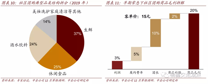 社区团购成为首个在低客单价下盈利的生鲜电商模式。社区团购模式由于节约了获客成本和末端配送的骑手成本,因而即使在客单价远低于即时性消费电商模式的情况下,我们估算稳态条件下仍能实现较好的利润率。如图表11,我们基于15元的客单价进行测算,在无价格战和高补贴的正常情况下,商品毛利可达近3.0元(毛利率20%),扣除团长佣金约1.5元,履约费率约0.8元,每单利润可以达约0.5元,对应近3%的利润率(vs实体商超利润率约为2%)。