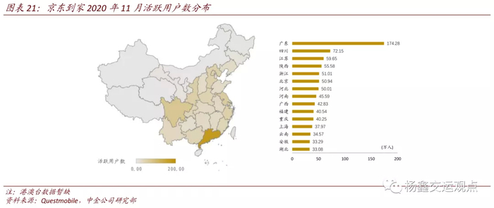 单量的提升离不开用户的增加与用户下单频率提高。截至3Q20,京东到家年活跃用户数(TTM)达3,730万(据Questmobile 2020年11月活跃用户数达1,040万人),业务覆盖全国1,200多个县区市,其中广东省使用人数最多,其次为四川省和江苏省(图表21)。过去三年,订单增长是京东到家业务收入快速增长的原因之一,未来我们认为订单量增长将继续驱动整体收入增长,而订单量的增长将主要通过下沉市场以及与京东合作两个方向实现: