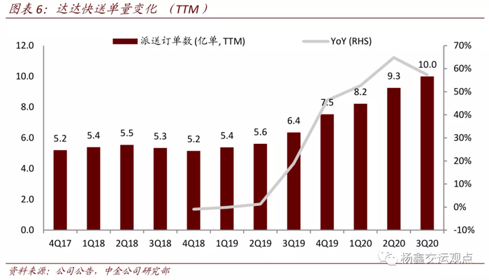 本部分我们主要聚焦于对达达快送业务的分析。作为达达集团旗下的本地即时配送平台,达达快送上的骑手通过众包模式开展配送服务。根据艾瑞咨询统计,达达快送2019年实现总订单量约6.36亿单,根据最新季报披露,截至3Q20前12个月,达达快送总订单量超10亿单,在中国社会化同城配送市场份额中位居第一。