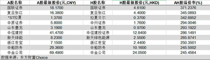 AH股溢价率前十的公司