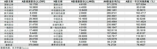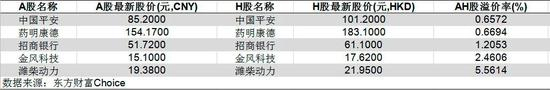 部分AH股溢价较高的热门公司