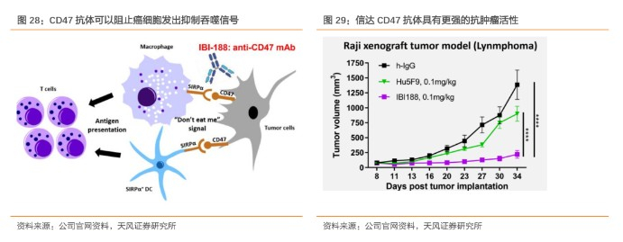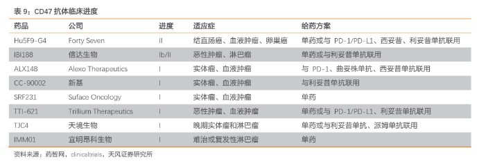 信达IBI188进入II期临床,处于第一梯队。目前临床进度最快的是FortySeven公司的Hu5F9-G4,其与利妥昔单抗的免疫组合疗法,在治疗弥漫性大B细胞淋巴瘤(DLBCL)和滤泡性淋巴瘤(FL)的1期试验中,取得了令人瞩目的积极结果:50%(11名)接受治疗的患者有客观缓解,其中8名患者有完全缓解。