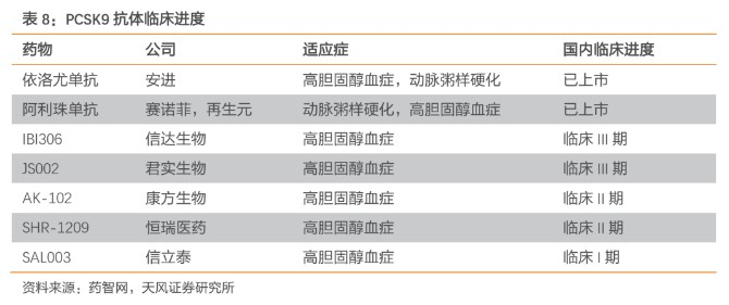 国内已有两种PCSK单抗上市,信达IBI306进入III期临床。原研企业安进已于2018年7月在中国获得NDA批准。IBI306是信达生物开发的PCSK9单抗,拟用于治疗高胆固醇血症,其在I期临床试验中获得了良好的耐受性和可接受的安全性数据,目前正在开展III期临床试验,国内君实生物、康方生物及恒瑞医药等公司相关产品也进入II期以后临床试验。