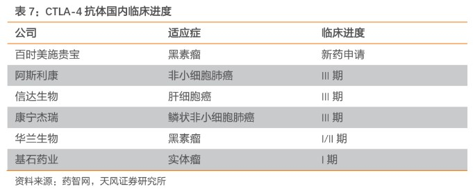 信达IBI-310已进入临床III期,国内进度处于第一梯队,目前国内暂无该靶点药物上市。百时美施贵宝公司已经在中国提交了伊匹单抗的NDA申请,紧随其后的是阿斯利康(III期)。信达生物在国内主要的CTLA-4抑制剂开发商中处于领先地位,IBI-310已进入III期临床试验,Ia/Ib期临床结果显示IBI310具有可接受的安全性及疗效。