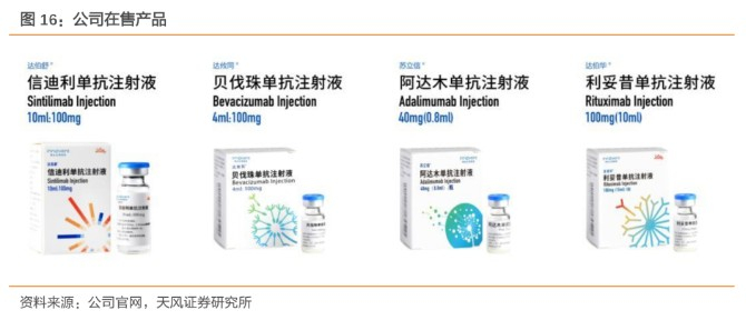 目前公司在售产品集中在肿瘤和自身免疫领域,最近两年成功推出4个产品,分别是信迪利单抗注射液(PD-1)、贝伐珠单抗注射液(VEGFA)、阿达木单抗注射液(TNF-α)、利妥昔单抗注射液(CD20)。