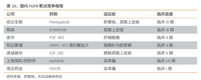 FGFRs是癌症驱动基因,通过诱导促有丝分裂和生存信号、促进肿瘤细胞侵袭转移、促进血管生成参与肿瘤发生发展进程的多重步骤。FGFR突变在不同适应症的肿瘤患者中有7%的概率出现。