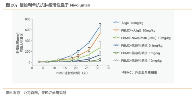 公司PD-1具有抗肿瘤活性强的优势。在小鼠SCID-Winn模型研究中,信迪利单抗抗肿瘤活性高于纳武单抗Nivolumab。甚至在百分之一的剂量下就取得了比纳武单抗更好的抗肿瘤效果,这意味着更好的特异性,预计在多靶点药物联合治疗上有望取得优势,这也促使礼来放弃开发自家的PD-1转而与信达合作。