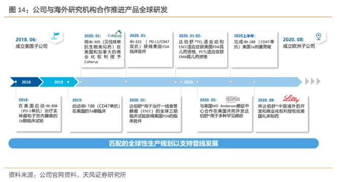 公司建立全球性研发平台,选择具有全球市场潜力的管线产品。公司结合强大的内部研发能力与外部战略合作,建立全球性的研发平台,通过自主或合作进行海外临床开发。公司在海外成立子公司,与MD Anderson癌症中心合作开发信迪利单抗用于多种罕见癌症,并与罗氏达成协议获得双特异性抗体和CAR-T技术平台相关权限。