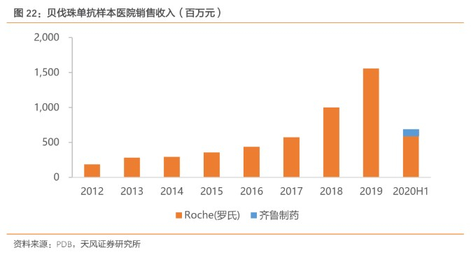 根据PDB的数据,2019年CD20单抗的样本医院销售额达到14亿元人民币,罗氏占据主要市场份额。伴随着市场的进一步渗透和更多国内企业的加入,利妥昔单抗费用可能会继续下降,预计原研药份额将随之缩小。