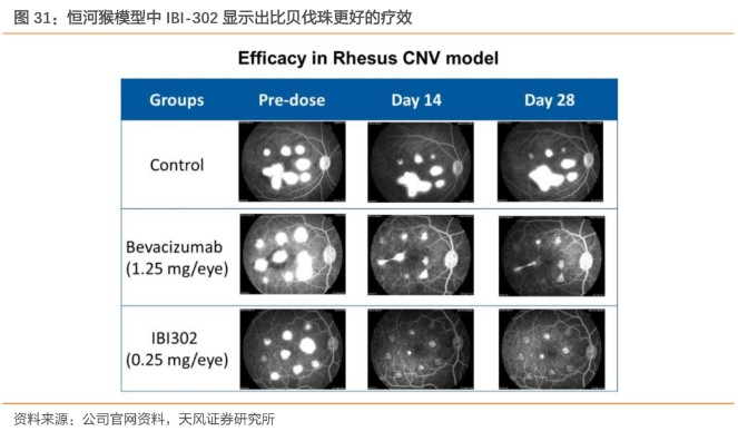 IBI-302是抗VEGF/补体的双特异性抗体,用于治疗眼底病,临床试验已经步入II期。该药同时抑制VEGF家族及补体蛋白的结合,因而可以同时抑制炎症反应及血管生成。在恒河猴CNV(脉络膜新生血管)模型中,IBI-3020.25mg剂量下显示出比1.25mg贝伐珠单抗更好的疗效。